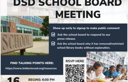 Davis School District’s current library materials review policy has resulted in dozens of books being removed from school library and classroom shelves. Many of these books are award-winning and well-reviewed literary works. As a result, the policy denies students access to a variety of ideas and perspectives that are an important part of a comprehensive education. It has also resulted in expensive and time-consuming reviews of books challenged under the policy Sign today to let the Davis School District Board of Education know they should revise the policy to keep books on library and classroom shelves, protect students’ right to read, and safeguard parents’ right to parent their own children without unnecessary government involvement.